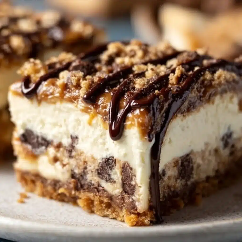 Take your chilled crust, then spread the creamy cheesecake mixture evenly over it. Next, drop spoonfuls of cookie dough on top of the cheesecake layer, gently swirling them together with a knife for that marbled look. Cover and chill the bars in the refrigerator for at least 4 hours, or overnight if you can resist!