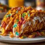 Fruity Pebbles cheesecake tacos bring together the nostalgia of your favorite childhood cereal with the rich, creamy goodness of cheesecake. Imagine that crunchy, fruity flavor wrapped inside a soft, sweet taco shell, filled generously with a smooth cheesecake mixture. It’s a whirlwind of textures and flavors that makes dessert not just enjoyable, but also just plain fun. You get that zingy cheesecake filling paired with the joyful crunch of Fruity Pebbles, making each bite an adventure. Yum!